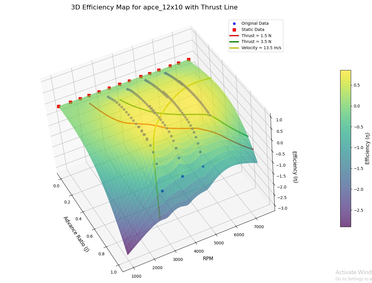 - Motor + Propeller - The efficiency of the motor-propeller combination is simulated using propeller data from the UIUC Propeller Data site and motor efficiency data from the Tyto Robotics motor database. Efficiency curves are constructed using this data, allowing us to estimate the total efficiency at the correct operating point and output the best-performing combinations.